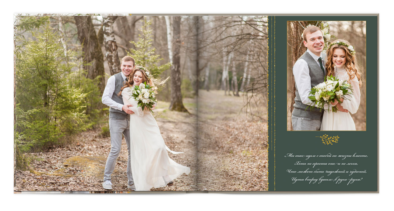 Друге - весільний альбом повинен бути довговічним. Щоб через роки ви могли раз за разом переживати щасливі моменти свята. Розглядати її з дітьми і навіть онуками. Щоб навіть ... заповідати могли! Жарти жартами, але високоякісний друк, точну передачу кольору і міцна палітурка (наше ноу-хау!) Ми гарантуємо. Тому що друкуємо книги у власній друкарні.